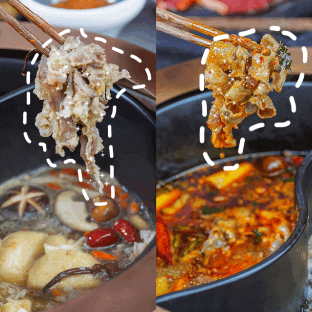 牛肉涮菌汤锅,羊肉涮牛油锅,涮变色之后就可以吃了,幸福感爆棚!