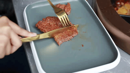 每块牛排纹路十分清晰,用手轻轻一撕就会裂开哦~这么大块的肉当然不能直接啃,来,配上专用的刀叉,开动!